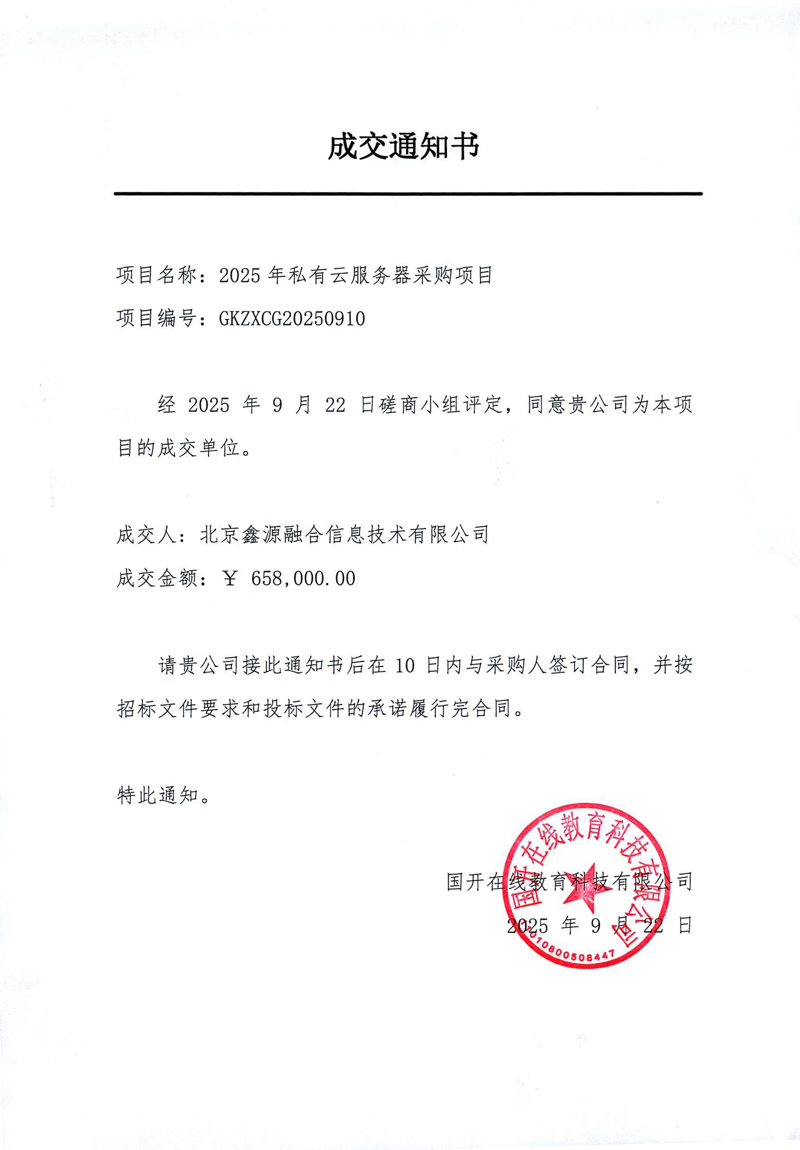 国开在线教育科技有限公司2025年私有云服务器采购项目的潜在供应商通过联系采购单位以电子邮件获取采购文件,2025年9月22日9点30分(北京时间)前提交响应文件。