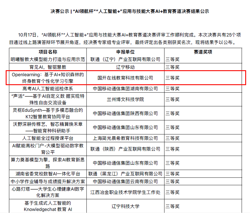 其中,数字教育赛道共有25个项目参加角逐。经决赛专家组评审,国开在线教育科技有限公司报送的项目“Openlearning:基于AI+知识森林的终身教育个性化学习引擎”荣获教育赛道全国三等奖。