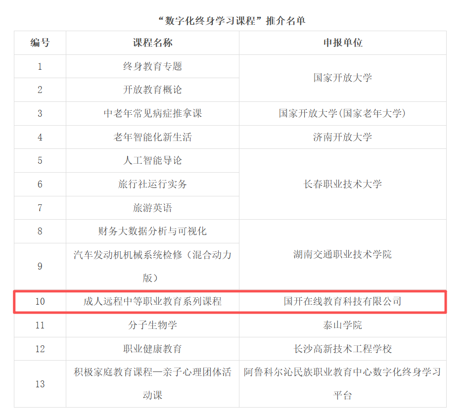 近日,中国成人教育协会正式公布第二批“数字化终身学习课程”推介征集活动结果,国开在线教育科技有限公司(以下简称“国开在线”)推出的“成人远程中等职业教育系列课程”凭借其创新的教学模式、优质的课程资源以及显著的育人成效,成功入选推介名单,并在中国成人教育协会官网展示推荐。这一荣誉标志着该课程在服务全民终身学习、推动职业教育数字化转型方面的实践成果,获得了行业权威机构的高度认可。