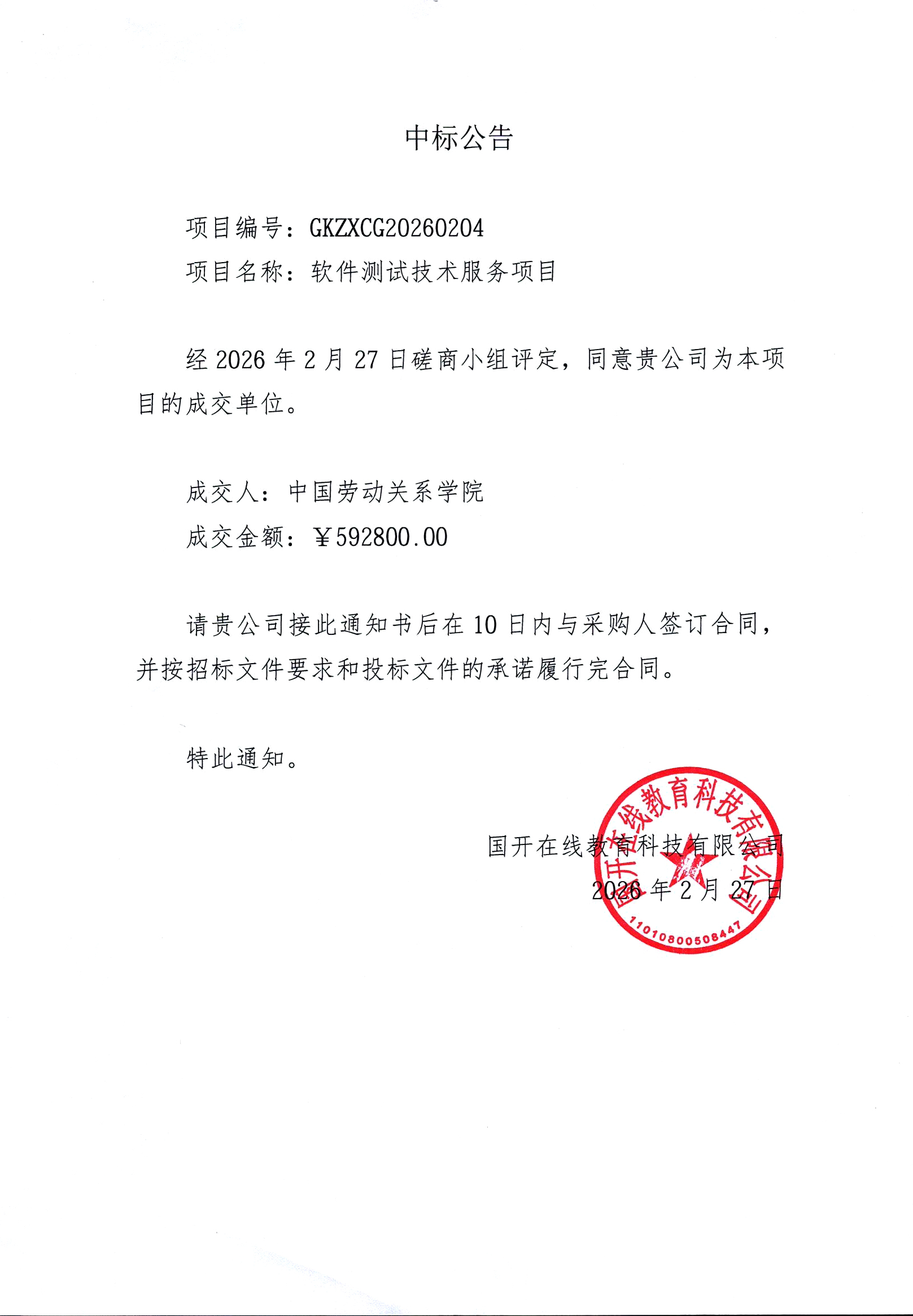国开在线教育科技有限公司软件测试技术服务供应商,通过联系采购单位以电子邮件形式获取采购材料,于2026年2月13日09点00分(北京时间)前提交响应文件。