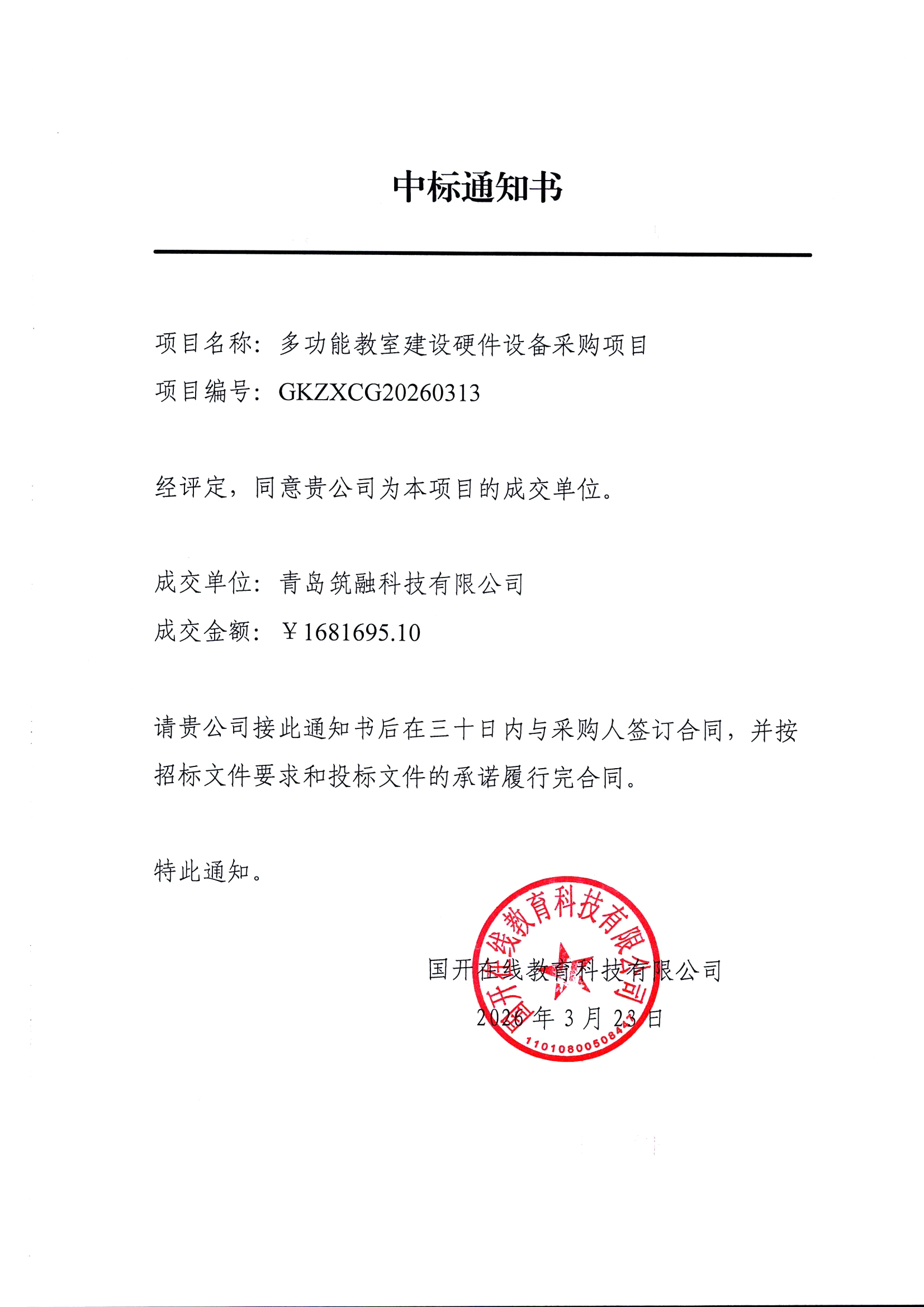国开在线教育科技有限公司多功能教室建设硬件设备采购项目的潜在供应商应通过联系采购单位以电子邮件形式获取采购材料,于2026年3月20日09点00分(北京时间)前提交响应文件。