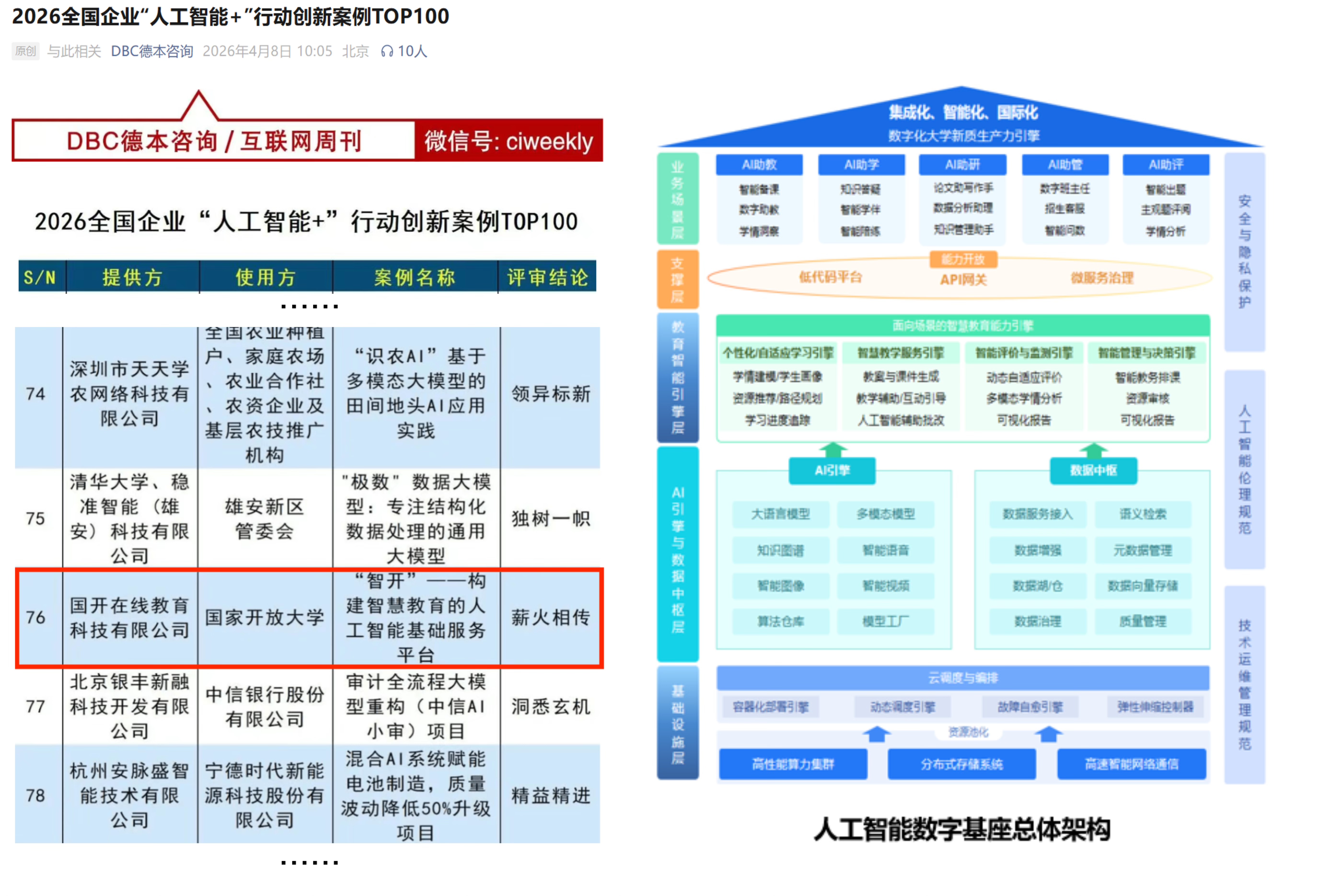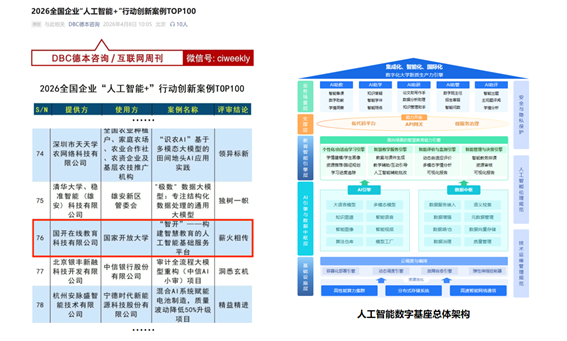 在人工智能加速迈向场景化落地、深度融入各行业核心业务的背景下,由互联网周刊联合eNet研究院、德本咨询开展的“2026全国企业‘人工智能+’行动创新案例TOP100”正式发布。该评选聚焦人工智能与实体场景的深度融合,遴选具有示范意义和推广价值的标杆实践。国开在线教育科技有限公司以“‘智开’——构建智慧教育的人工智能基础服务平台”成功入选,成为终身教育领域人工智能规模化应用的代表性成果之一。